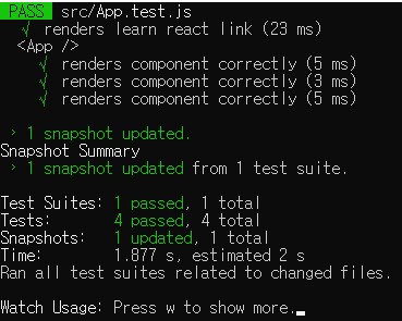 여기서 Snapshots 정상적으로 되면 아래와같이 __snapshots__ 폴더가 생기며 안에 스냅샷 파일(App.test.js.snap)이 생긴다.