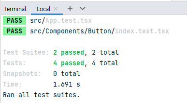 screen.getByText를 사용하여 Button 컴포넌트의 필수 Props인 label의 설정한 값으로 Button 컴포넌트를 찾고 이렇게 찾은 Button 컴포넌트를 toBeInTheDocument를 사용하여 화면에 표시되어 있는지 확인한다.